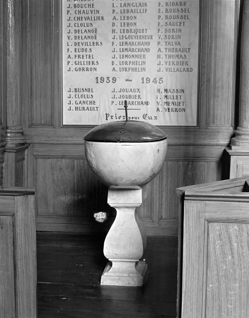 Fonts baptismaux ; baldaquin des fonts baptismaux ; tableau : Baptême du Christ (La Fontenelle fusionnée en Val-Couesnon en 2019),