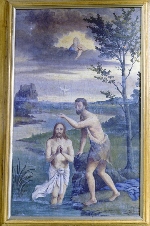 Fonts baptismaux ; baldaquin des fonts baptismaux ; tableau : Baptême du Christ (La Fontenelle fusionnée en Val-Couesnon en 2019),