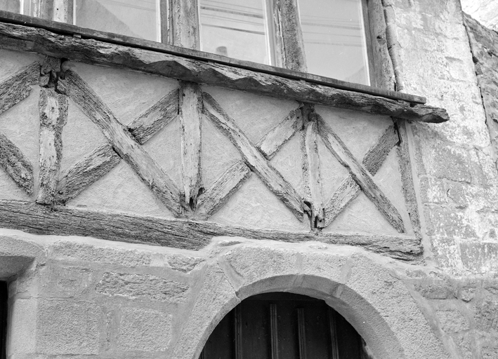Maison, avec pan de bois, détail au-dessus de la porte.Immatriculation