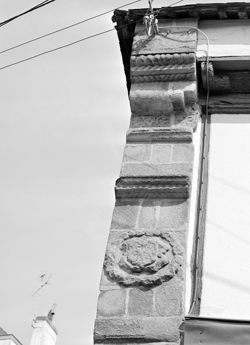 Maison, sculpture sur les encorbellements du mur latéral gauche : partie supérieure.Immatriculation