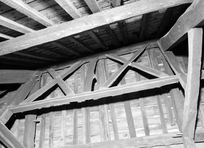 Charpente, sous-faîtage étrésillonnée en croix de Saint-André.Immatriculation