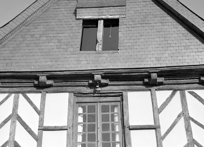 Elévation antérieure, partie gauche : encorbellement à entretoises mouluréesImmatriculation