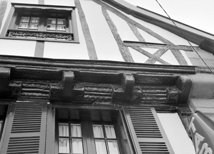 Elévation antérieure, détail de l'encorbellement du 2e niveau : entretoises mouluréesImmatriculation