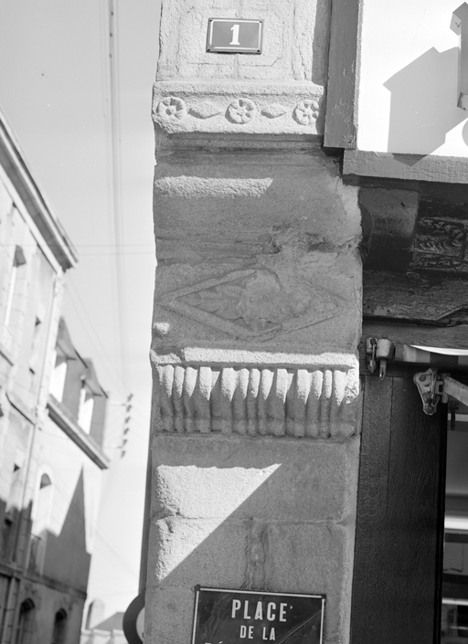 Elévation antérieure. Décor sculpté du mur-gouttereau gauche.Immatriculation