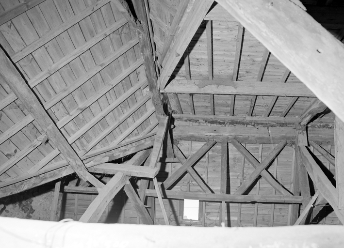 Charpente, étrésillonnement du sous-faîtage en croix de St-André.Immatriculation