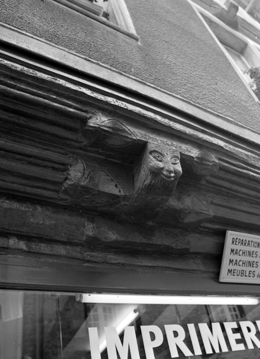 Elévation antérieure, entretoises en sifflet, et solives à décor de têtes humaines (retravaillées ?)Immatriculation