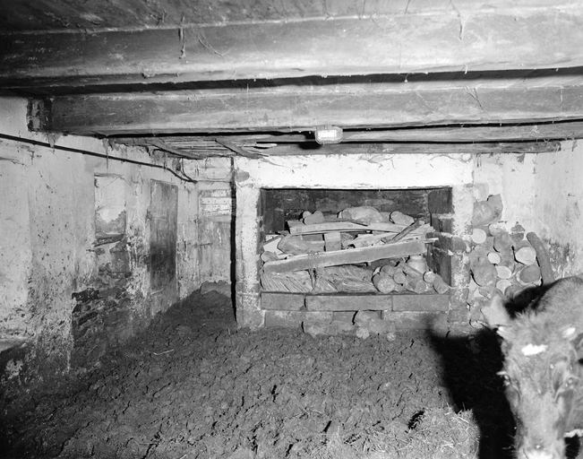 Logis daté 1787, pignon ouest, cheminée et porte menant vers le puits (à gauche). (1979)Immatriculation