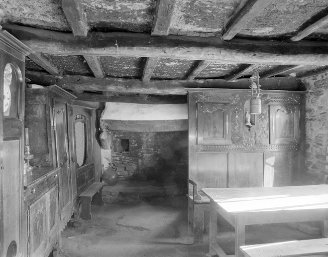 Salle commune 2, vue générale vers l'est. Mur nord : front des armoires (armoire, horloge, buffet-vaisselier et lit-clos près du feu avec son banc). Mur sud : drustuilh en place et table à manger. (1979)Immatriculation