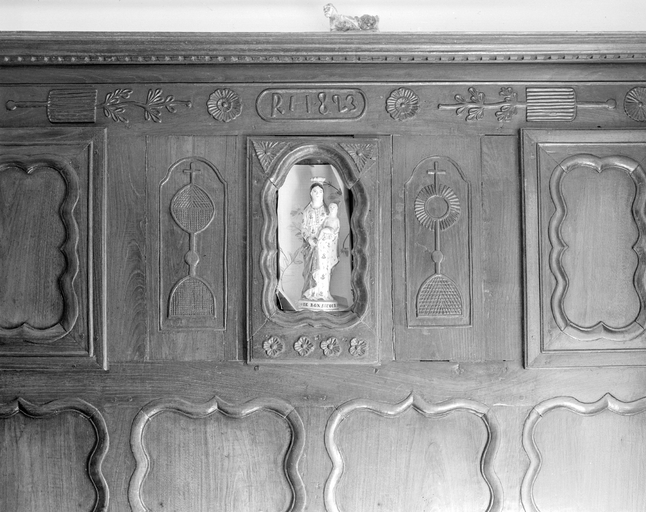 Drustuilh 1 daté 1823, en place, vue rapprochée de la niche à Vierge, de l'ostensoir et du ciboire. (1979)Immatriculation