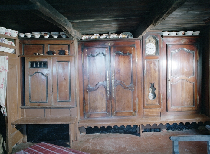 Mur nord, front des armoires 5 : armoires, horloge, lit-clos près du feu, "bank koste'n ti" et rangée de bols sur les corniches. Vue prise de face. (1979)Immatriculation