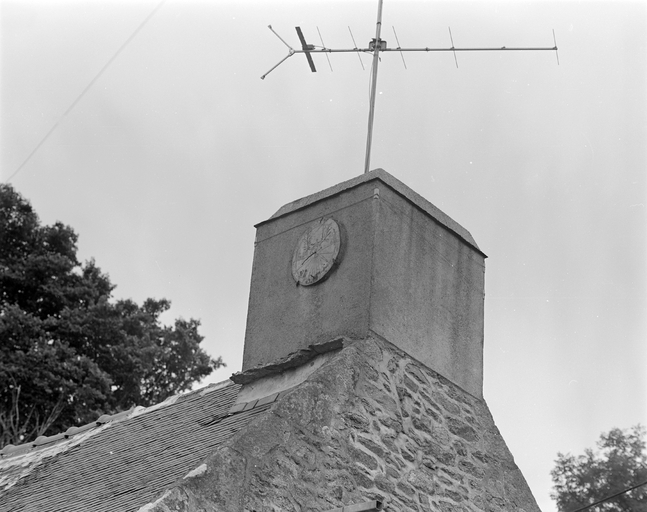 Esquibien, manoir. Cadran solaire daté 1616 sur la souche de cheminée est du logis. Couronne de laurier et blason. (1979)Immatriculation