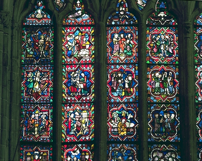 Verrière de la baie 100 (verrière légendaire) : Jugement dernier, Vie du Christ, Histoire d'Abraham, Vie de sainte Catherine, Vie de sainte Marguerite, évocation des évêques de Dol,