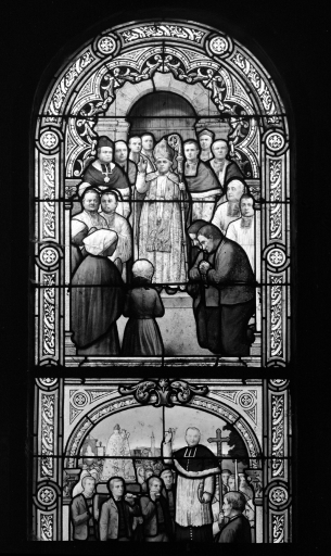Verrière 7 : Mgr Falguières, évêque de Saint-Brieuc, au milieu du ClergéImmatriculation