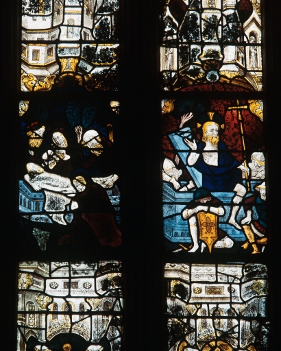 Maîtresse-vitre : Verrière à personnages : Vie de saint Jacques, Vie du Christ (baie 0),