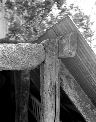 Gouetres : hangar, détail de l'assemblage charpente - pilierImmatriculation