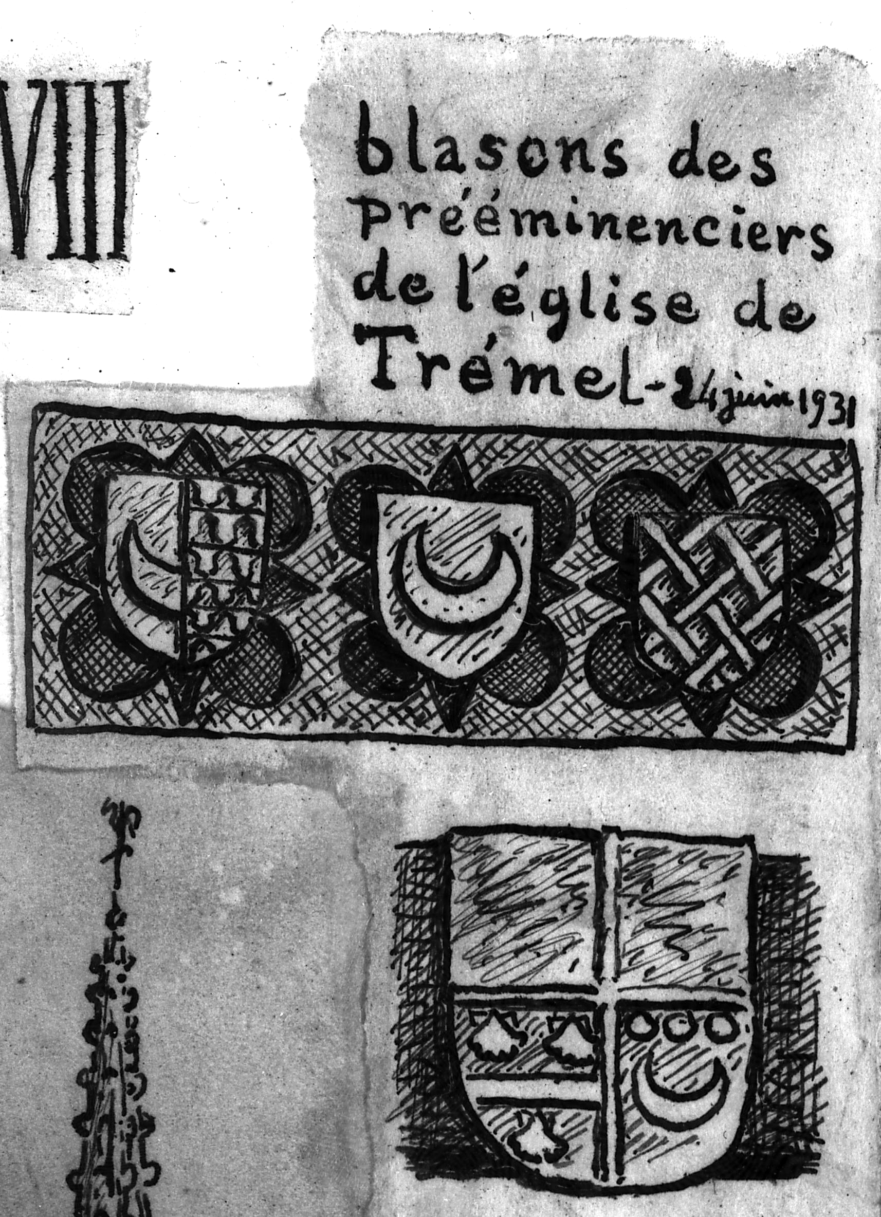Trémel : église paroissiale Notre-Dame, blasons des prééminenciers, croquis par Henri Frotier de la Messelière, 24 juin 1931Immatriculation