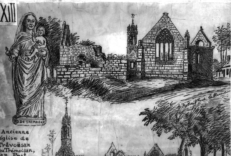Prat : église de Trévoësan ou Trémoisan, écroulée en 1916 et statue recueillie dans l'église de Prat, croquis par Henri Frotier de la Messelière, 10 juin 1930Immatriculation