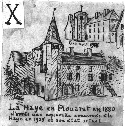 Plouaret, La Haye : manoir, croquis en 1880 d'après une aquarelle conservée au manoir et son état actuel par Henri Frotier de la Messelière, 1935Immatriculation