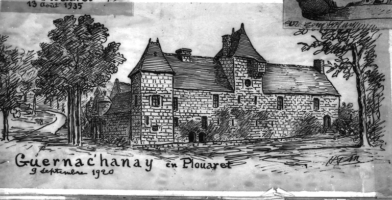 Plouaret, Guernanchanay : croquis du manoir par Henri Frotier de la Messelière, 9 septembre 1920. Elévation sudImmatriculation