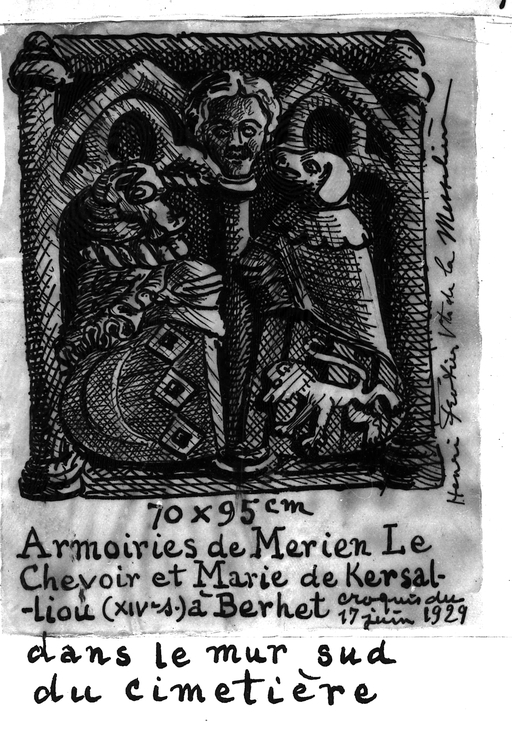 Berhet : mur sud du cimetière, armoirie de Merien Le Chevoir et Marie de Kersalliou (14e siècle), croquis par Henri Frotier de la Messelière, 17 juin 1929Immatriculation