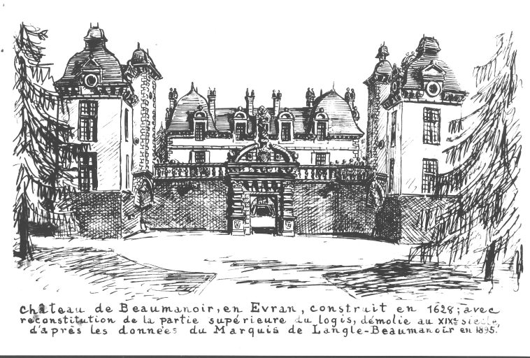 Croquis, château de Beaumanoir en Evran, construit en 1628 avec reconstitution de la partie supérieure du logis, démolie au XIXè siècle d'après les données du Marquis de Langle-Beaumanoir en 1895.Immatriculation