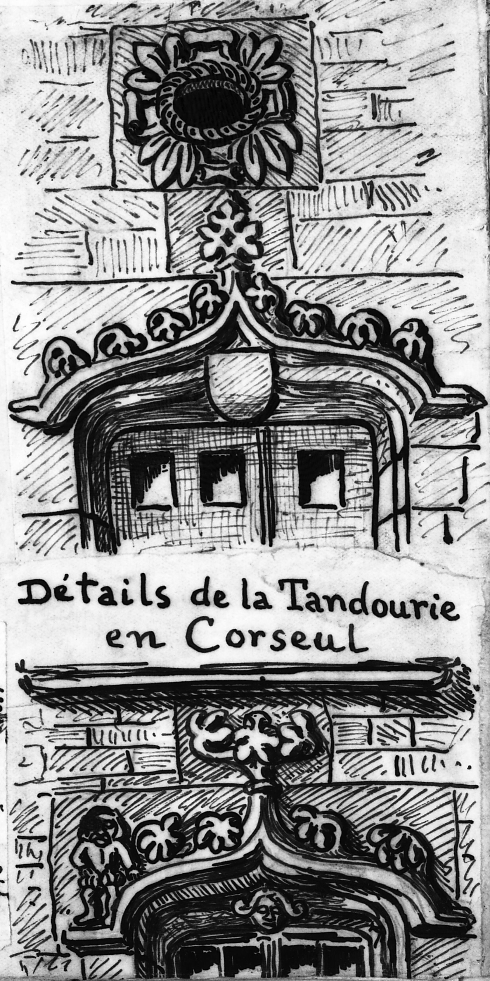 Croquis de détails d'ornementations du manoir de La Tandourie, réalisé par Frotier de la MesselièreImmatriculation
