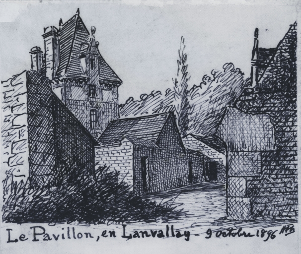Croquis, chapelle Saint René en Evran avant destruction partielle, 15 octobre 1896 ; armes des Ferron de la Ferronnays en Calorguen sur la porte sud, sur les trois autels et sur le sacraire.Immatriculation