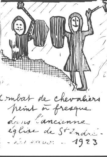 Croquis, Saint-André-des-Eaux, avril 1923 - Combat de chevaliers peints à fresque dans l'ancienne église de Saint-André-des-Eaux, 1923.Immatriculation