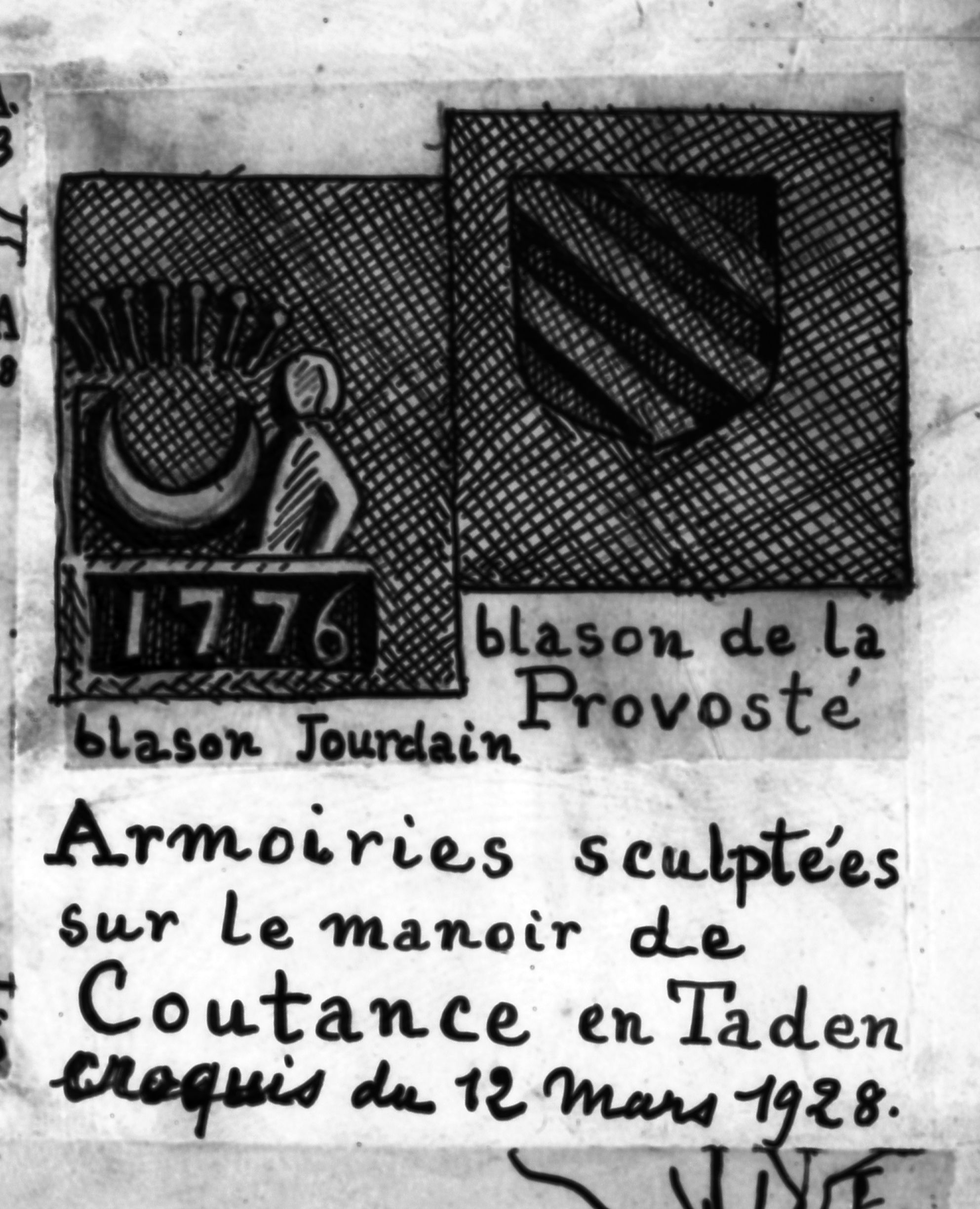 Armoiries sculptées siur le manoir de Coutance en Taden croquis du 12 mars 1928, par Henri Frotier de la MesselièreImmatriculation