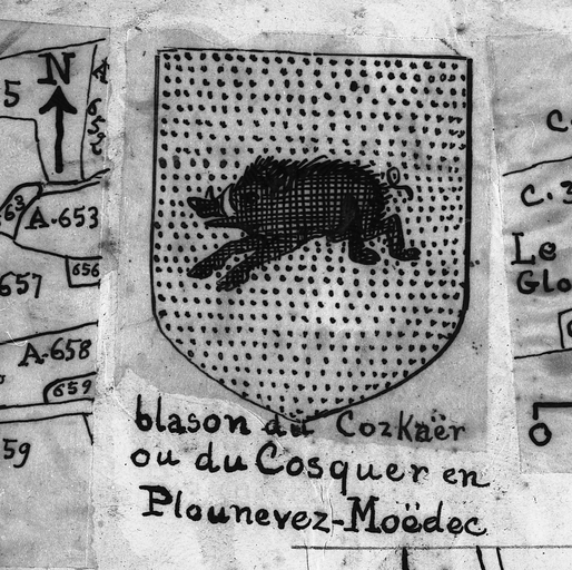 Plounévez-Moëdec, Le Cosquer : ancienne métairie noble, croquis du blason du Cozkaër ou du Cosquer par Henri Frotier de la Messelière, 1931Immatriculation