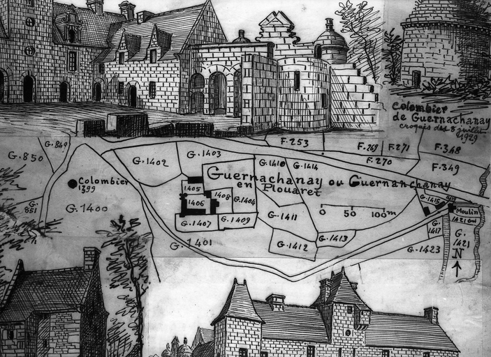 Plouaret, Guernanchanay : croquis du manoir et de son plan cadastral par Henri Frotier de la Messelière, 9 septembre 1920. Cour et élévation nord, revers du portail monumentalImmatriculation