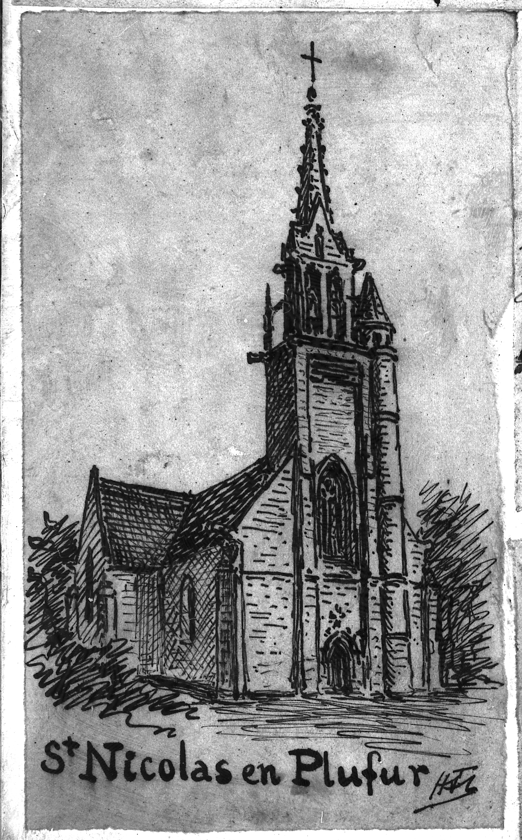Plufur : chapelle Saint-Nicolas, vue générale depuis le nord-ouest, croquis par Henri Frotier de la Messelière, 1935Immatriculation