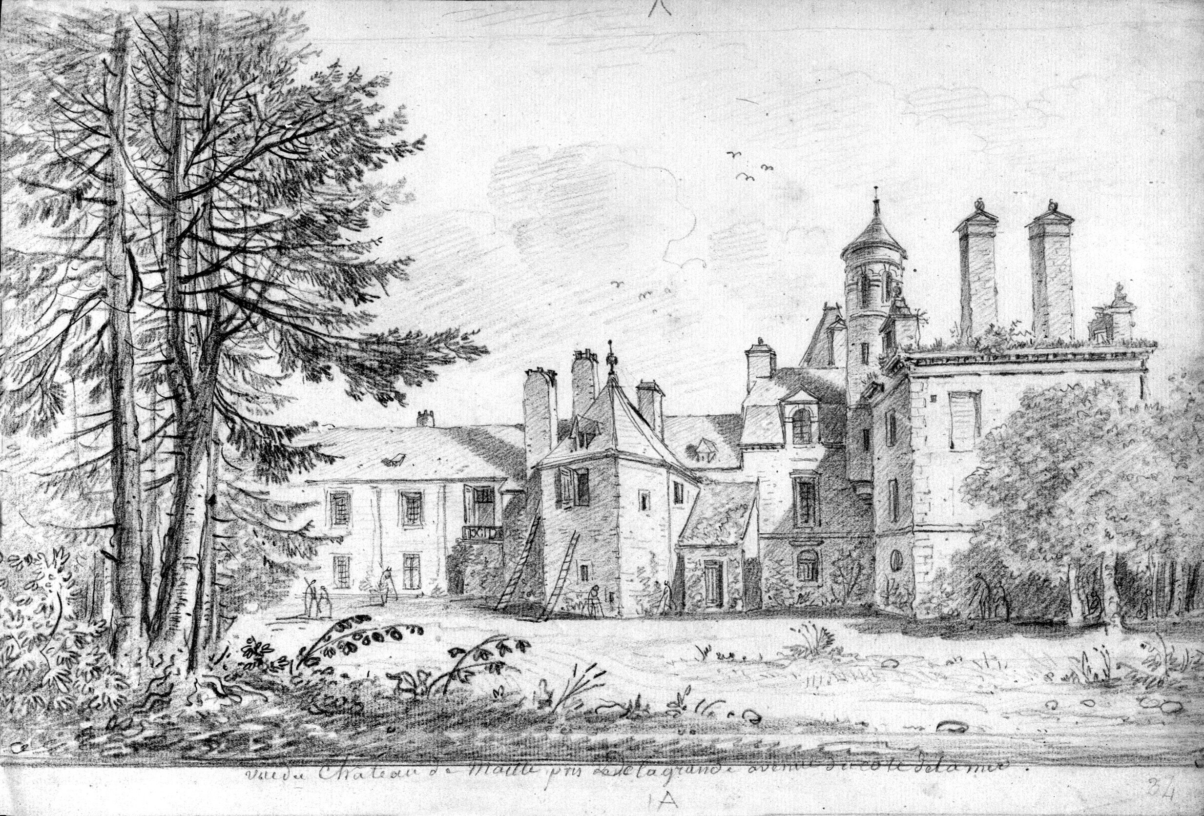 CASSAS, Louis-François. Vue du château de Maillé pris de la grande avenue du côté de la mer. Dessin au crayon noir, 30 cm x 20 cm environ, 1776.