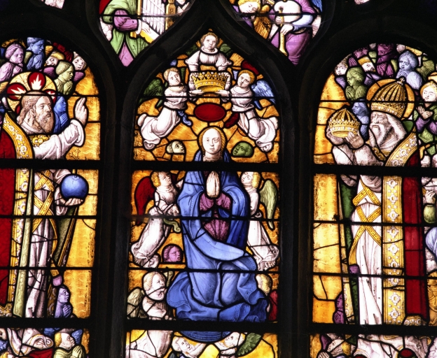 Verrière : Dormition et couronnement de la Vierge,