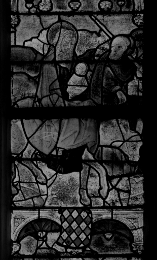 Verrière 1 : Vie de la Vierge, panneaux c2, c3 (Fuite en Egypte), vue générale.Immatriculation