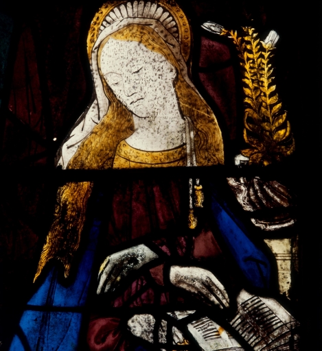 Verrière 1 : panneau b1, Annonciation, vue de détail.Immatriculation