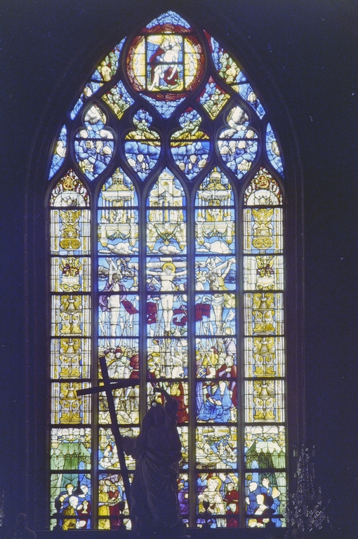 Verrière (maîtresse vitre) : Crucifiement (le), mort de Marie Madeleine, Trinité (baie 0), ancienne collégiale, actuellement église Sainte-Marie-Madeleine (Champeaux),