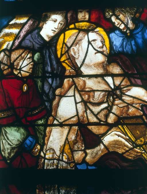 Le Crucifiement, mort de Marie Madeleine, Trinité (baie n°0), détail tête et buste de sainte Marie-Madeleine, dans la scène de la mort de Marie-Madeleine.Immatriculation