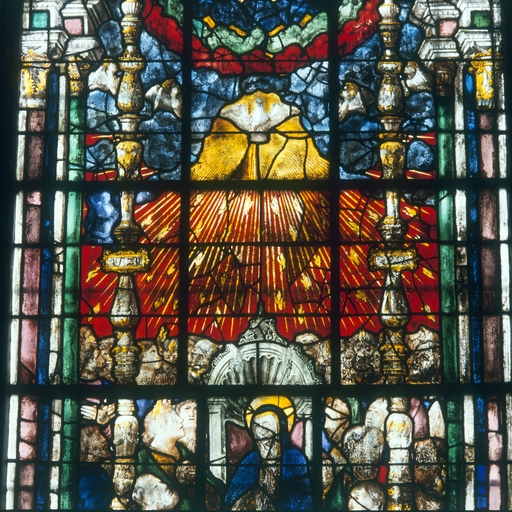 Verrière (verrière figurée) : Pentecôte (baie 8), ancienne collégiale, actuellement église Sainte-Marie-Madeleine (Champeaux),
