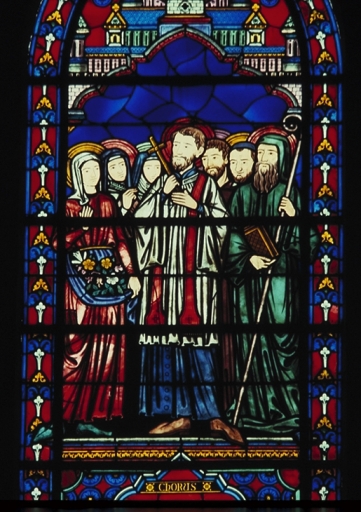 Ensemble des 9 verrières de la baie 0 : Crucifixion de saint Pierre, La Communion, Choeur des Martyrs, La Flagellation du Christ, La Cène, Choeurs des confesseurs et des vierges, Adoration des instruments de la Passion et des reliques, Christ pantocrator,