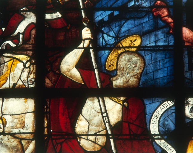 Verrière 3 : Descente aux limbes, buste et mains du Christ, vue de détail.Immatriculation