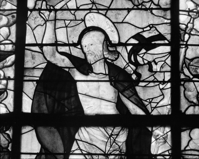 Verrière 6 : Résurrection, buste du Christ, vue de détail.Immatriculation