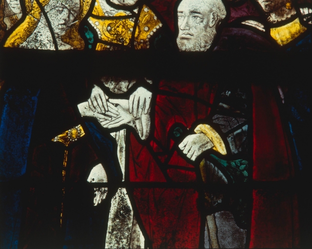 Verrière 1, vie de la Vierge, mariage de Marie, détail des mains.Immatriculation
