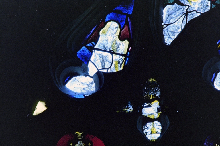 Verrière 1 : Vie de la Vierge, réseau et panneaux BII, CI.Immatriculation