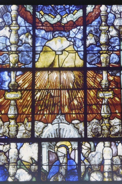 Verrière (verrière figurée) : Pentecôte (baie 8), ancienne collégiale, actuellement église Sainte-Marie-Madeleine (Champeaux),