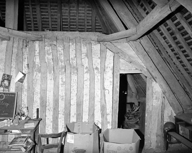 Comble, détail d'une cloison en pan de bois.Immatriculation