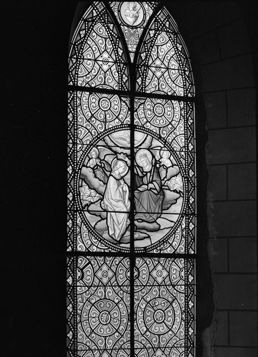 Verrières (6) (verrière historiée) : Couronnement de la Vierge, Jardin des Oliviers, Multiplication des pains, Adoration des bergers, Jésus parmi les docteurs, Présentation de la Vierge au temple (baies 5, 6, 7, 8, 90), église paroissiale Saint-Pierre, Immaculée-Conception (Mecé),