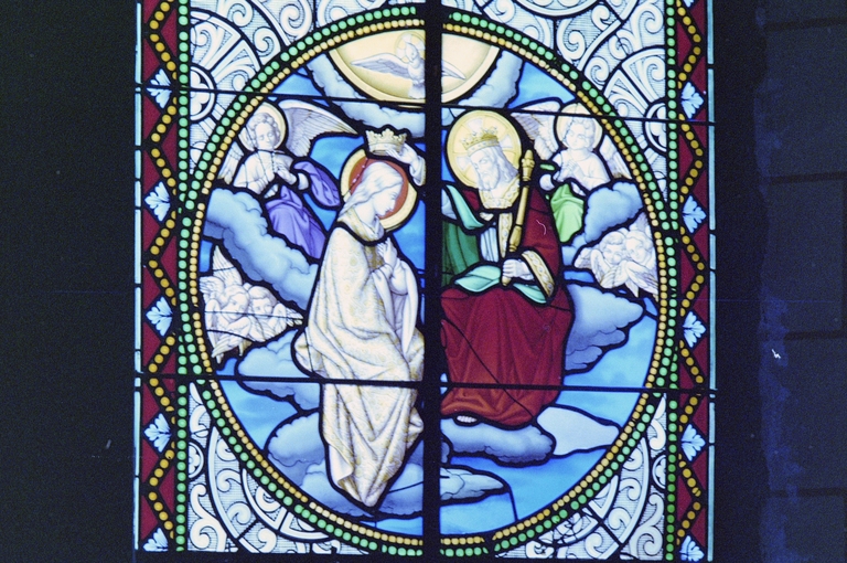 Verrières (6) (verrière historiée) : Couronnement de la Vierge, Jardin des Oliviers, Multiplication des pains, Adoration des bergers, Jésus parmi les docteurs, Présentation de la Vierge au temple (baies 5, 6, 7, 8, 90), église paroissiale Saint-Pierre, Immaculée-Conception (Mecé),