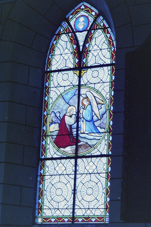 Verrières (6) (verrière historiée) : Couronnement de la Vierge, Jardin des Oliviers, Multiplication des pains, Adoration des bergers, Jésus parmi les docteurs, Présentation de la Vierge au temple (baies 5, 6, 7, 8, 90), église paroissiale Saint-Pierre, Immaculée-Conception (Mecé),