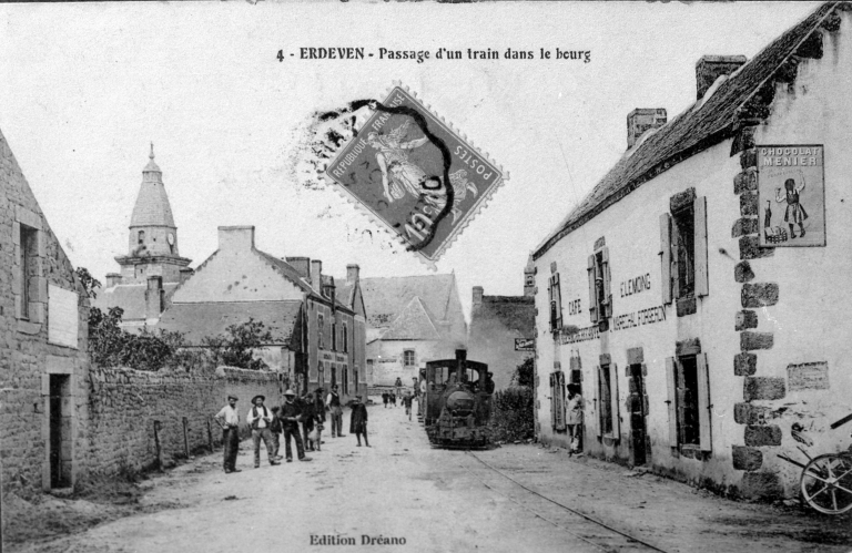 Passage d'un train dans le bourg. Carte postale vers 1920.Immatriculation